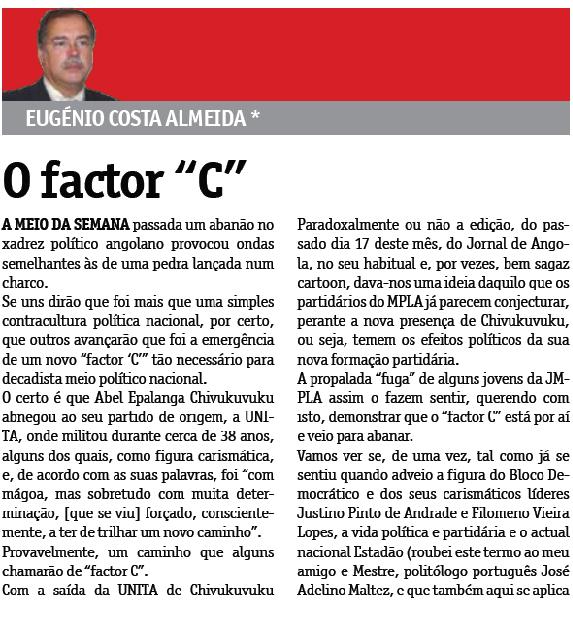 Por curiosidade, a nova organização política está, também ela, enquadrada no novo “factor C” e que, segundo o seu criador permitirá “Servir Angola, Servir os Angolanos” e dará aos eleitores nacionais – infelizmente, e ainda, só para os que estão em território nacional, – a oportunidade de “abrirem uma nova página” na cena política angolana.