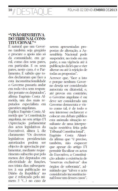 "As recentes eleições legislativas em Angola tinham matriz constitucionalizante? Ou seja, os deputados eleitos foram-no e estavam legitimados para discutir eventuais e profundas alterações à presente Constituição?O eleitorado quando foi colocar a sua cruzinha no boletim de voto sabia que estava a dar prorrogativas constitucionais aos seus eleitos? Tinha conhecimento das alterações que os partidos políticos concorrentes se propunham fazer?